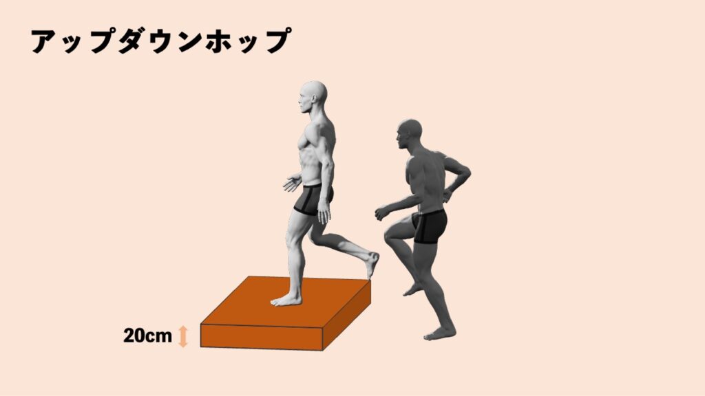 - アップダウンホップは前後方向に垂直ジャンプ時の減速動作の反復