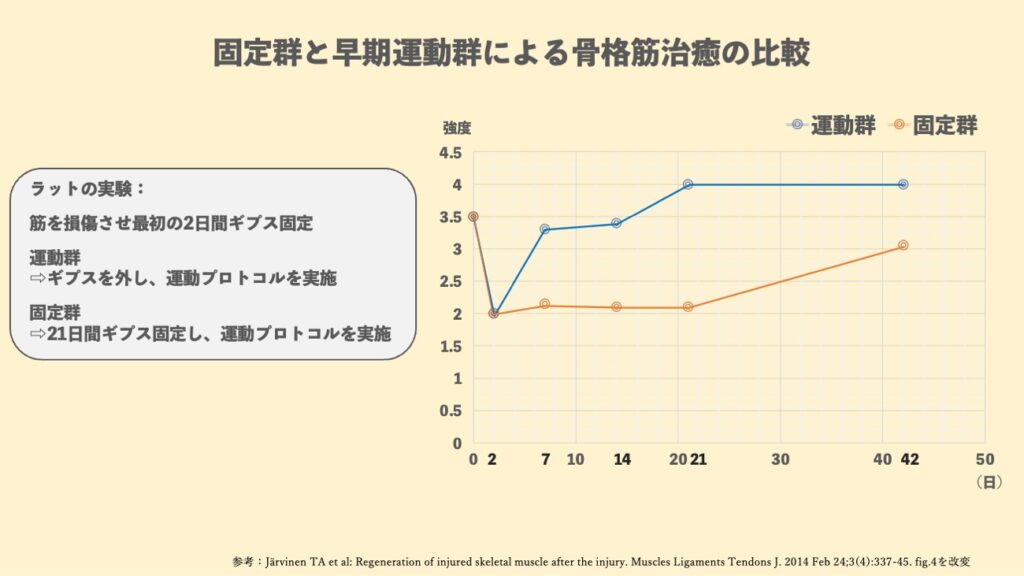 筋を損傷させ2日間ギプス固定後、運動群では筋の強度が早期に回復するのに対し